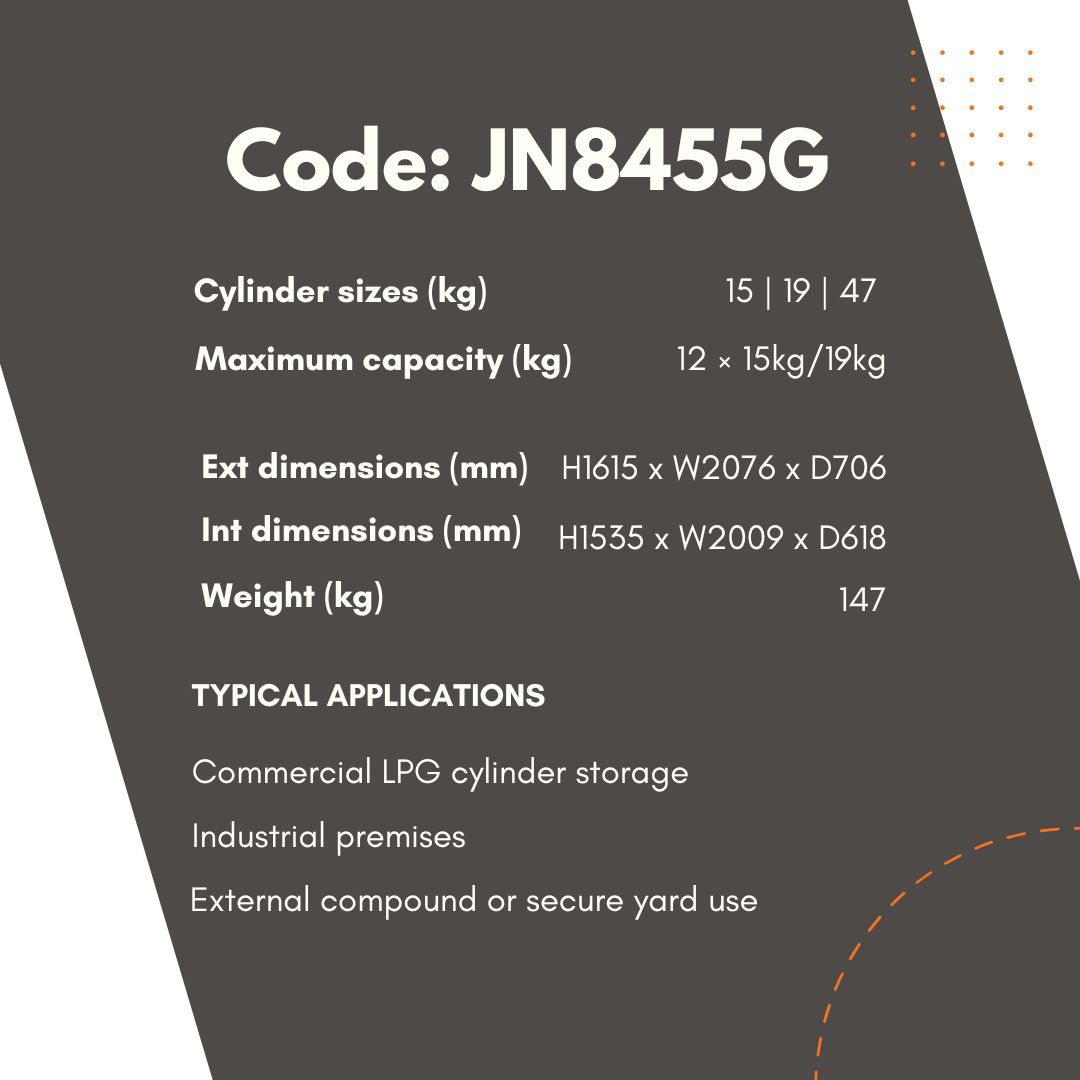 Able to store 12 x 15kg and 12 x 19kg cylinders or a combination of these sizes or other similar sizes (makes of bottle differ). The shelves can be removed to allow up to 5 x 47kg cylinders to be stored. The top shelf can only store 15kg or smaller.